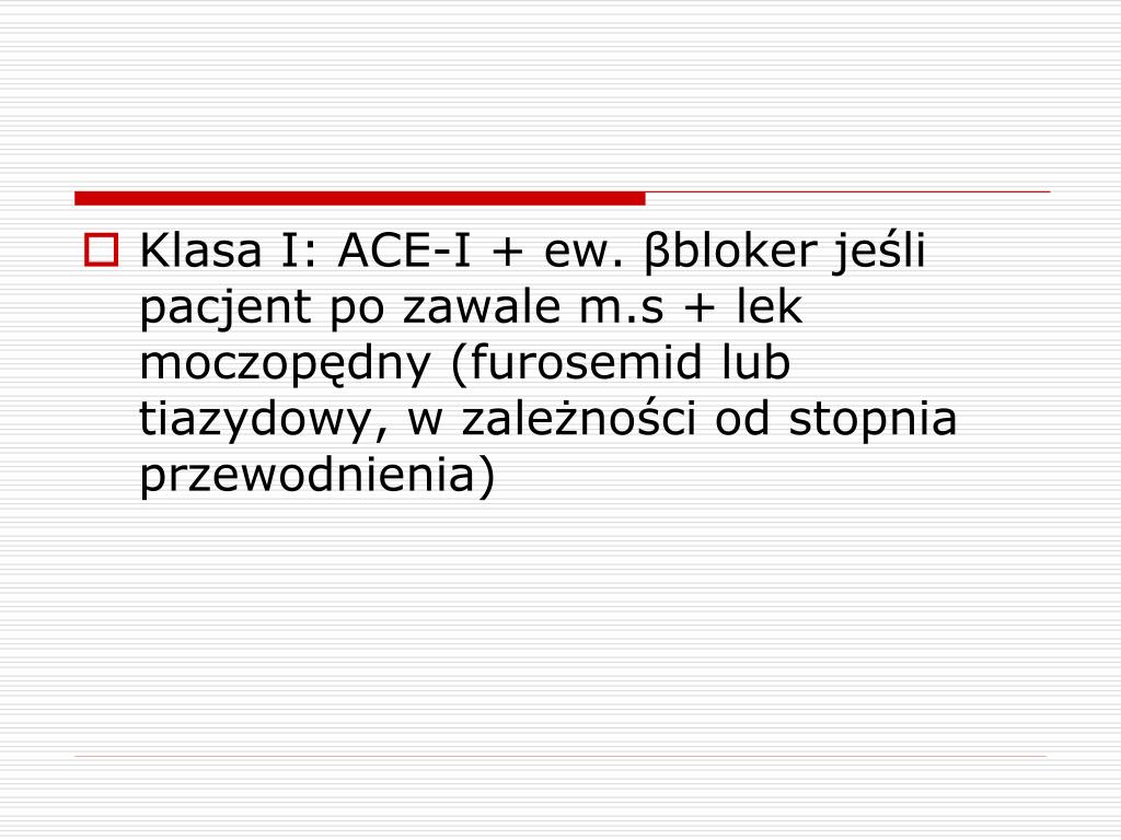 Klasa I: ACE-I + ew. βbloker jeśli pacjent po zawale m.s + lek moczopędny (furosemid lub tiazydowy, w zależności od stopnia przewodnienia)
