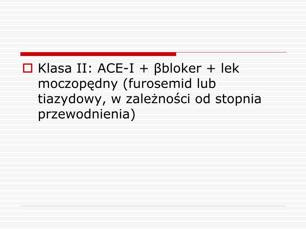 Klasa II: ACE-I + βbloker + lek moczopędny (furosemid lub tiazydowy, w zależności od stopnia przewodnienia)