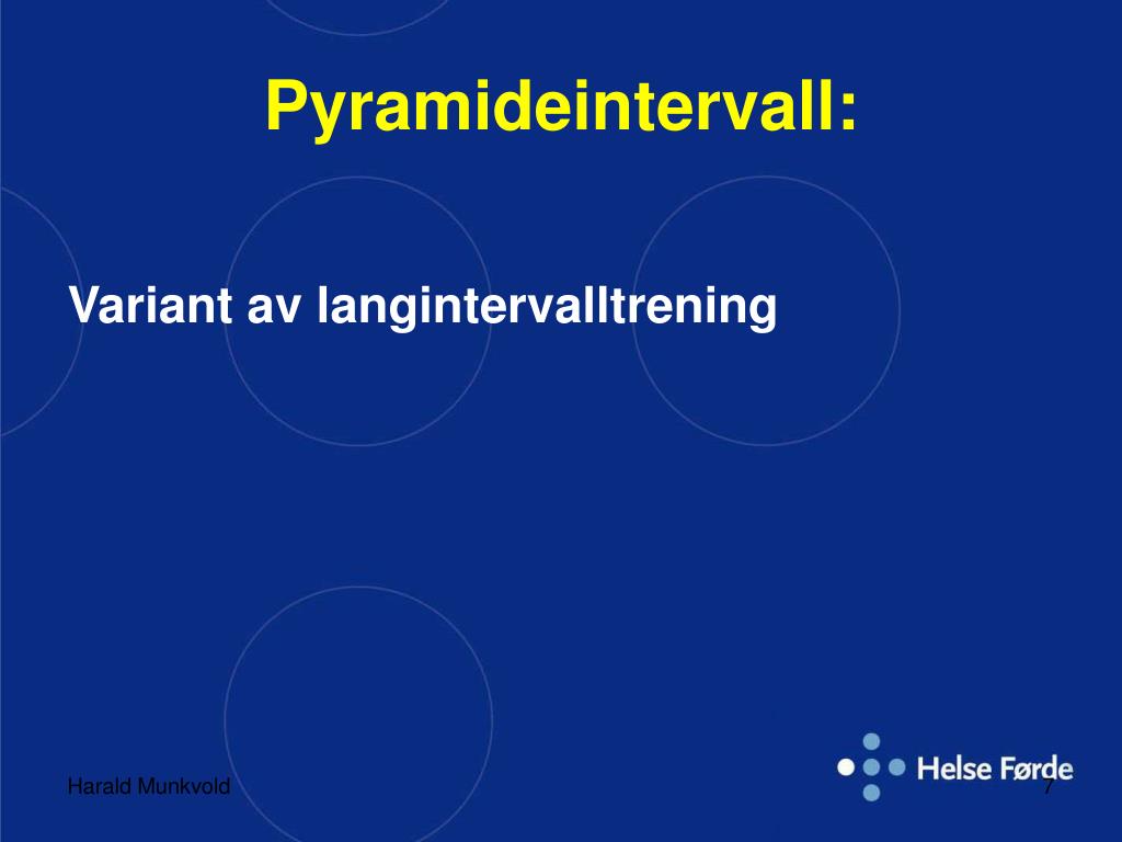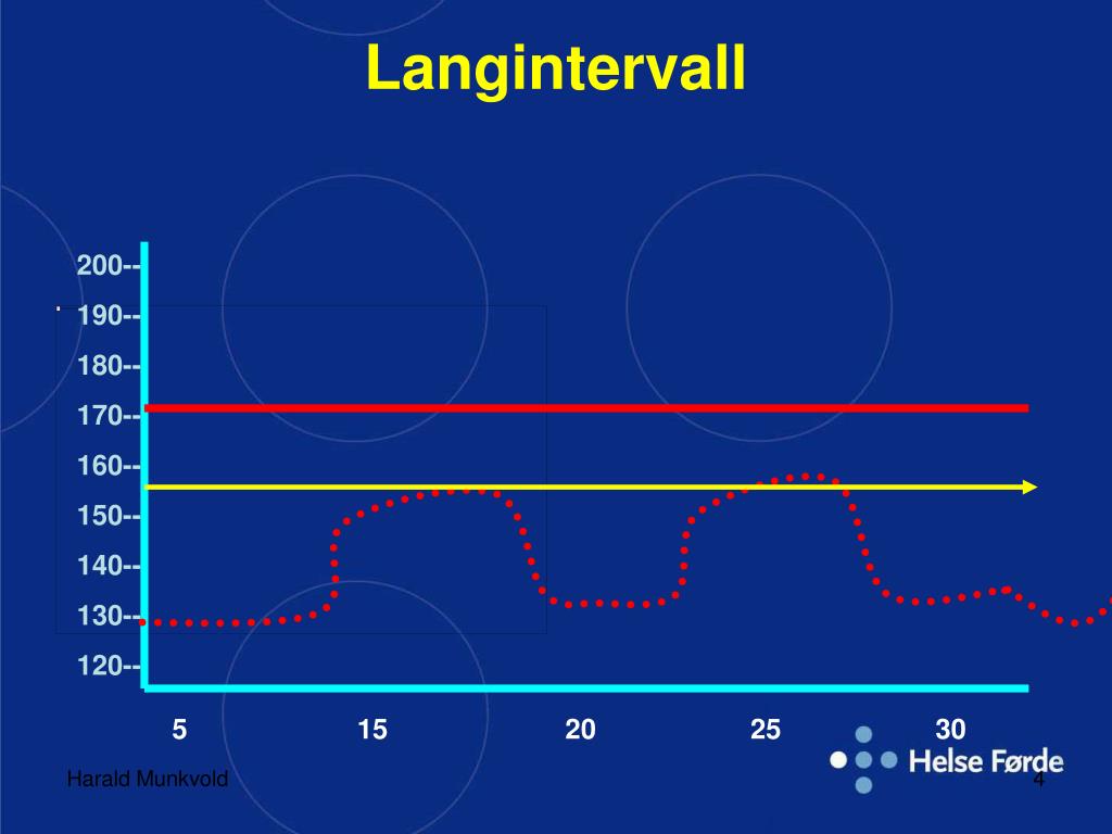 Langintervall trening: Moderat og høy intensitet • Pulsen sone ¾ (av fem) • Systematisk veksling mellom arbeid og hvile • Arbeidsperiodene er på 2-15 minutter • Pausen er halvparten av treningsperiodene 20 - 60 minutters varighet • 2-10 arbeidsperioder • Løping, ski, sykling, roing og svømming egner seg godt til denne arbeidsformen