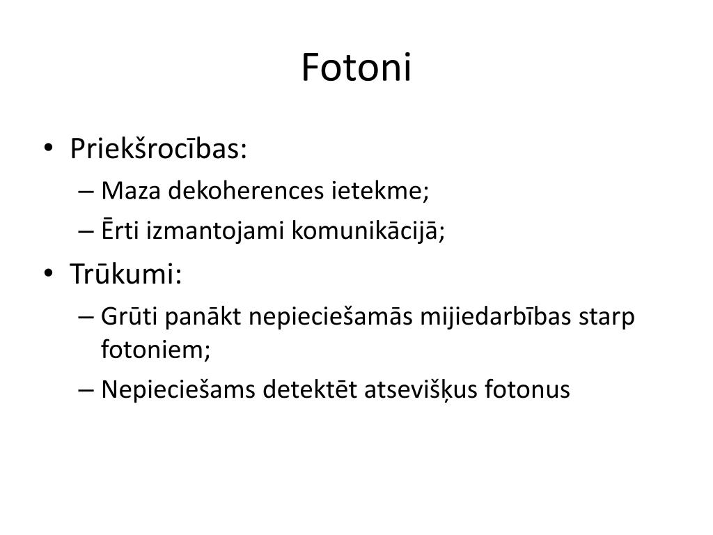 Fotoni • Priekšrocības: • Maza dekoherences ietekme; • Ērti izmantojami komunikācijā; • Trūkumi: • Grūti panākt nepieciešamās mijiedarbības starp fotoniem; • Nepieciešams detektēt atsevišķus fotonus
