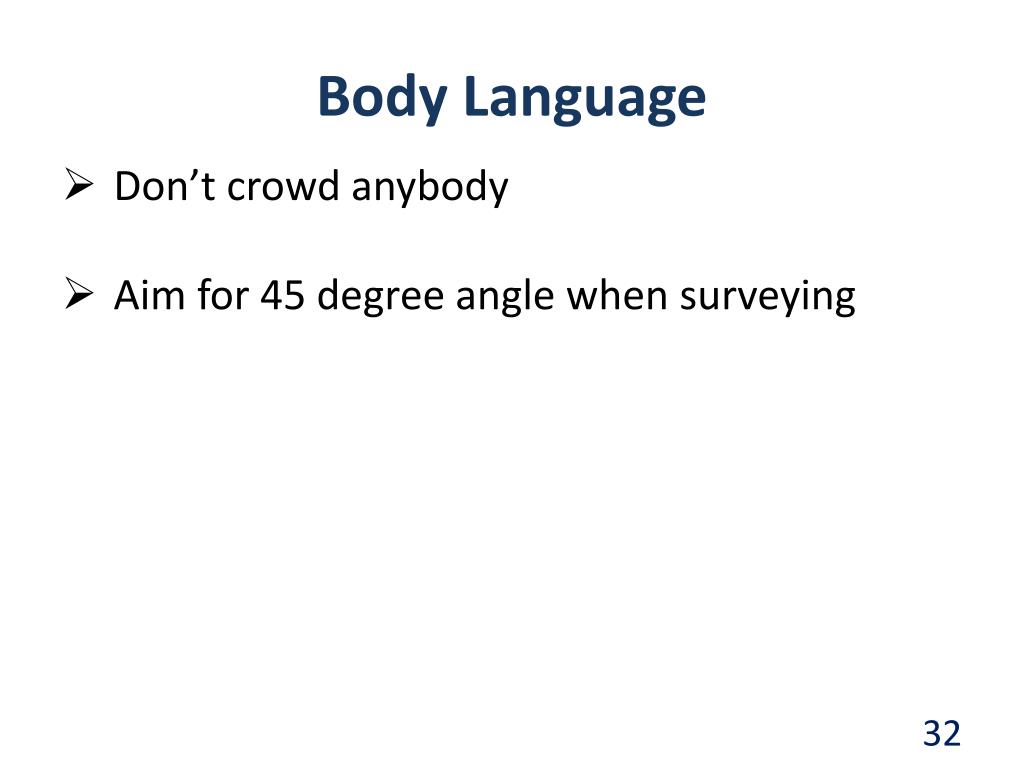Body Language • Don’t crowd anybody • Aim for 45 degree angle when surveying