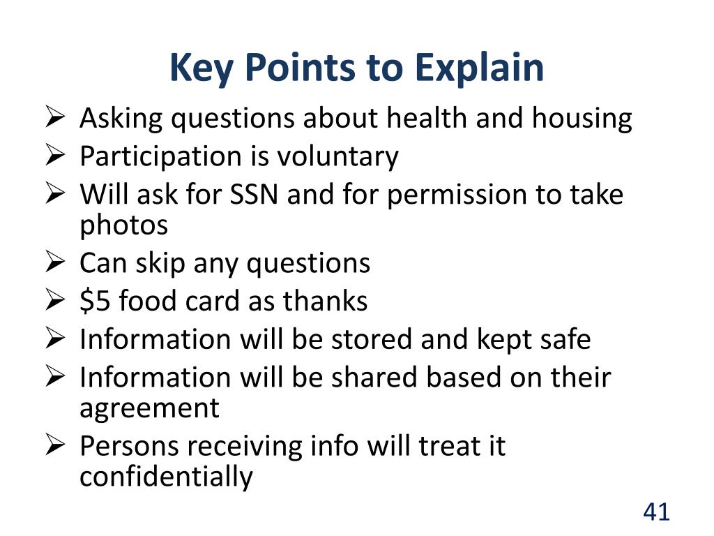 Key Points to Explain • Asking questions about health and housing • Participation is voluntary • Will ask for SSN and for permission to take photos • Can skip any questions • $5 food card as thanks • Information will be stored and kept safe • Information will be shared based on their agreement • Persons receiving info will treat it confidentially