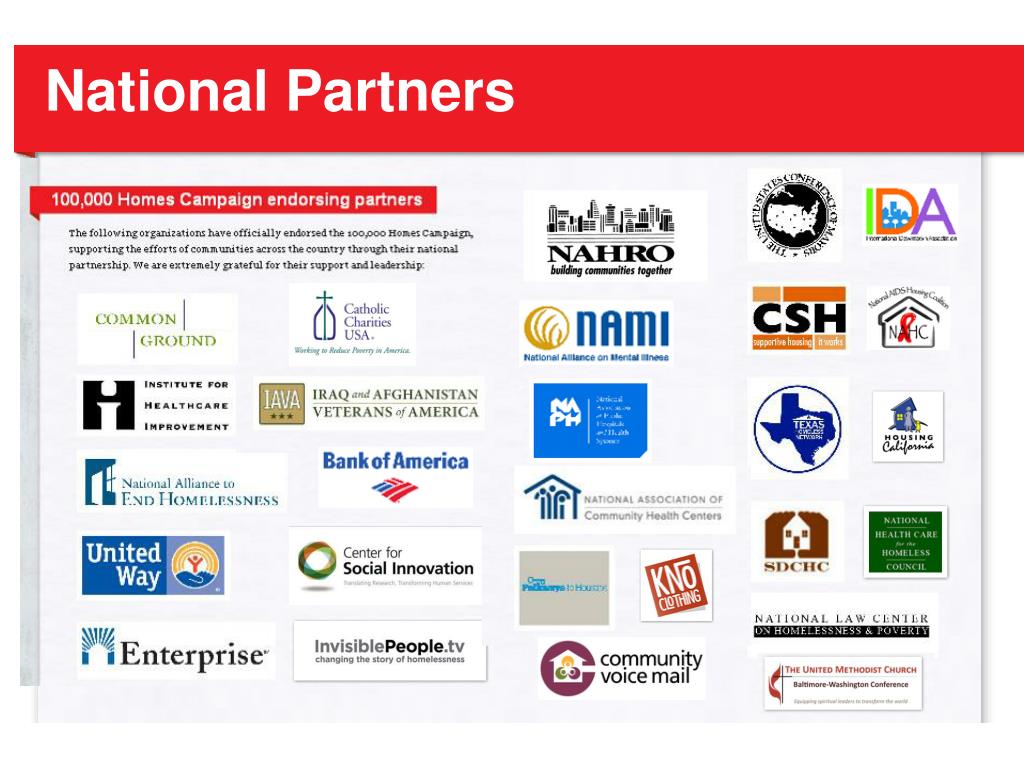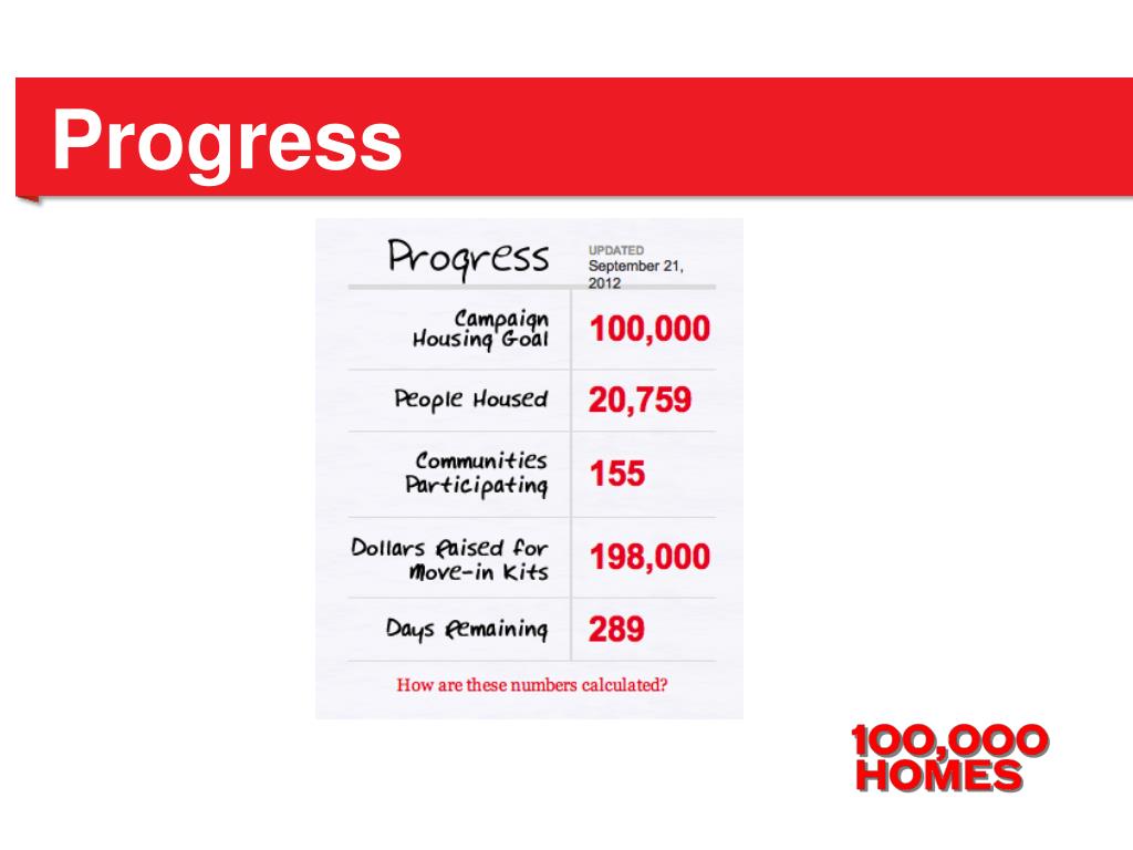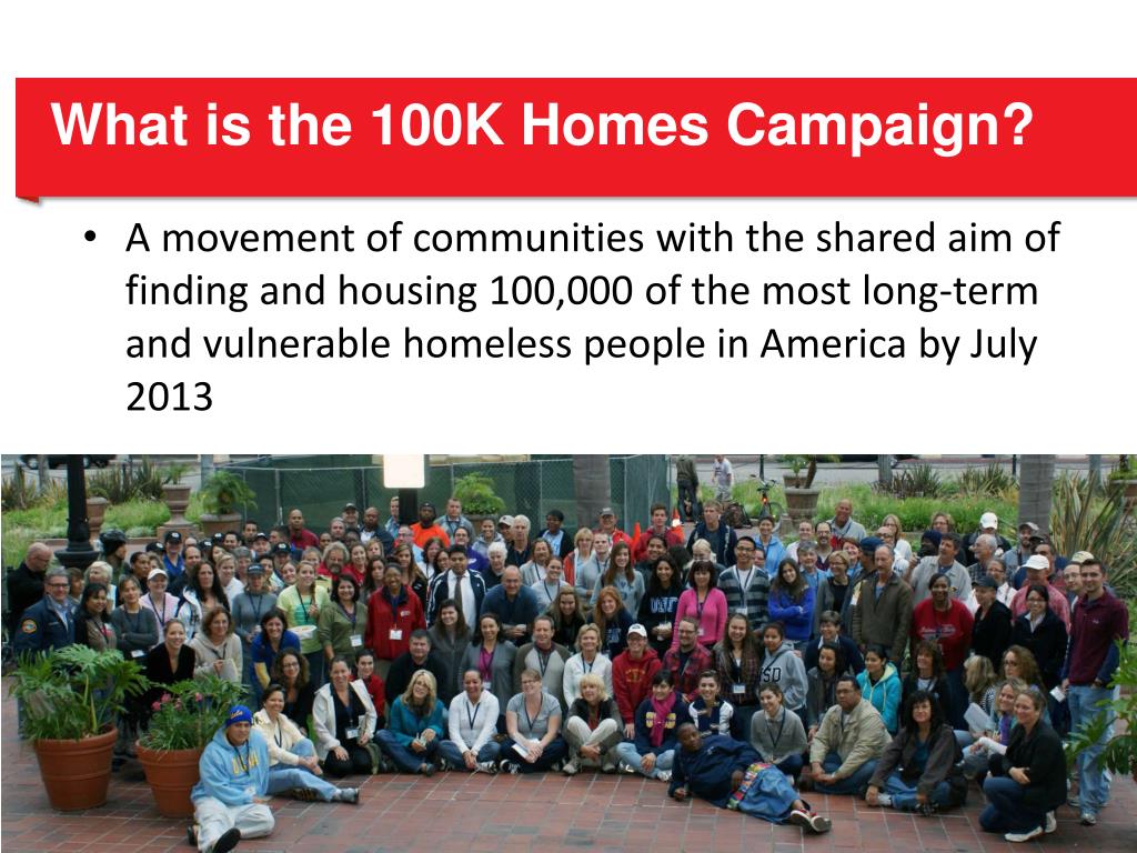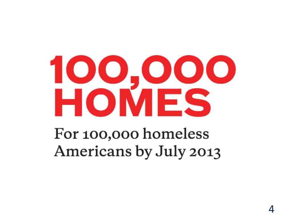 What is the 100K Homes Campaign? • A movement of communities with the shared aim of finding and housing 100,000 of the most long-term and vulnerable homeless people in America by July 2013