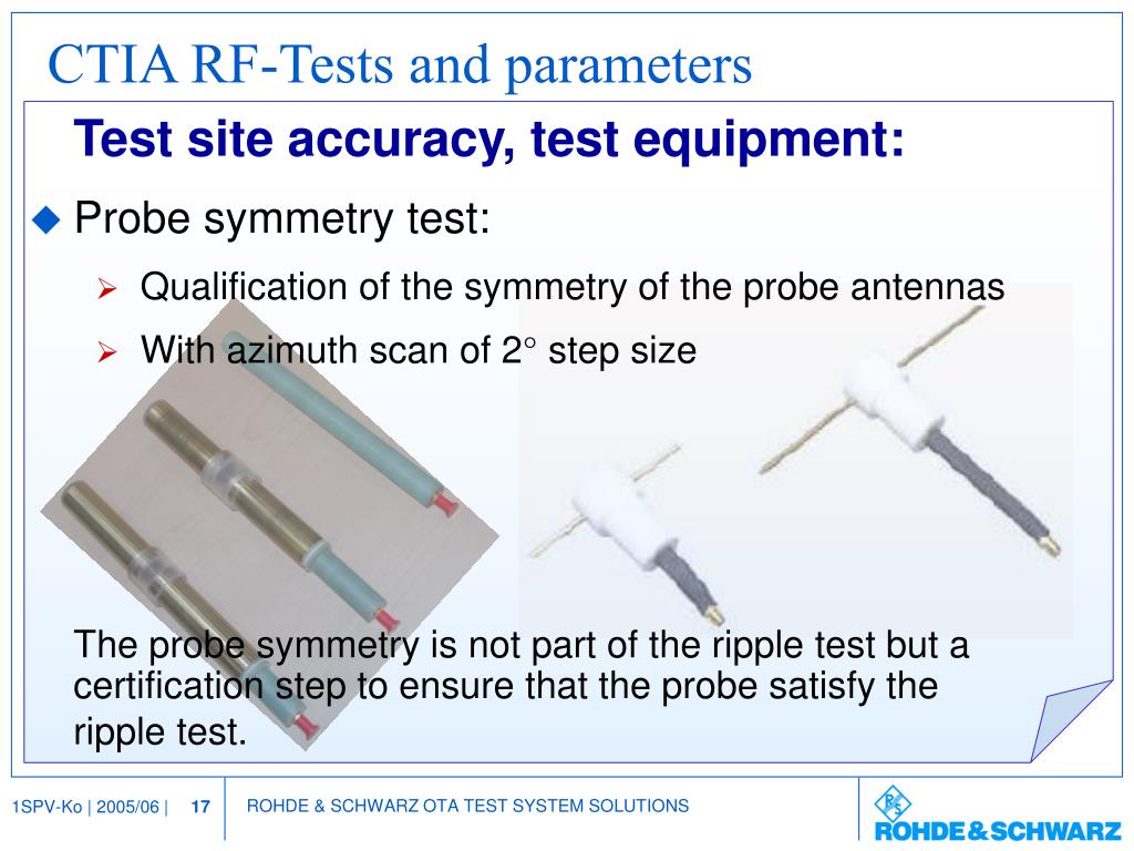CTIA RF-Tests and parameters Test site accuracy, test equipment: • Probe symmetry test: • Qualification of the symmetry of the probe antennas • With azimuth scan of 2° step size The probe symmetry is not part of the ripple test but a certification step to ensure that the probe satisfy the ripple test.