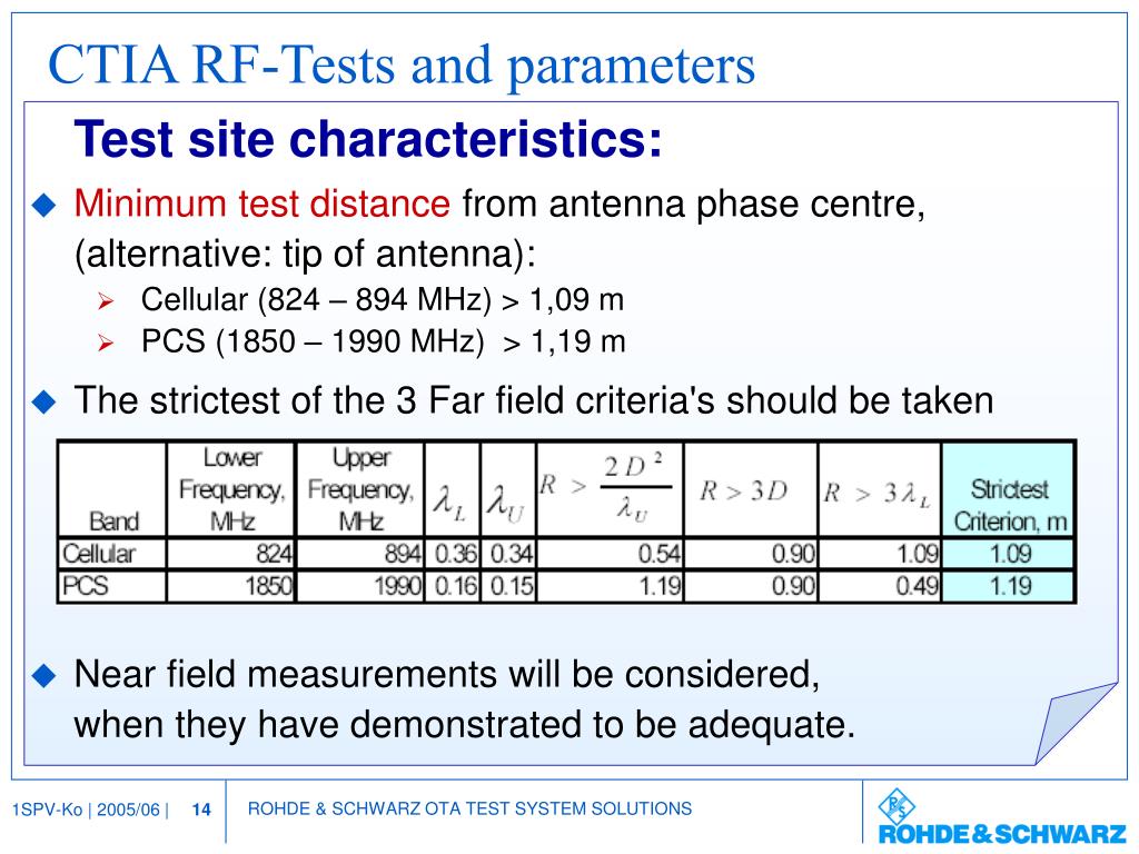 CTIA RF-Tests and parameters Test site characteristics: • Minimum test distance from antenna phase centre, (alternative: tip of antenna): • Cellular (824 – 894 MHz) > 1,09 m • PCS (1850 – 1990 MHz) > 1,19 m • The strictest of the 3 Far field criteria's should be taken • Near field measurements will be considered, when they have demonstrated to be adequate.