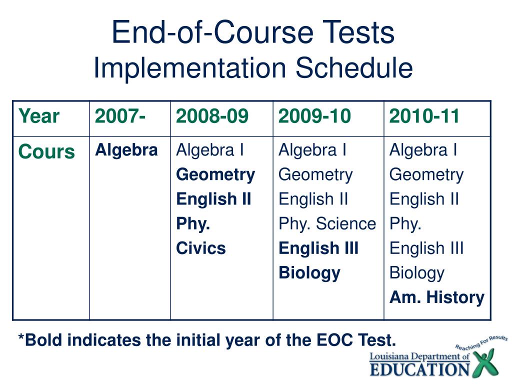 End-of-Course Tests Implementation Schedule *Bold indicates the initial year of the EOC Test.