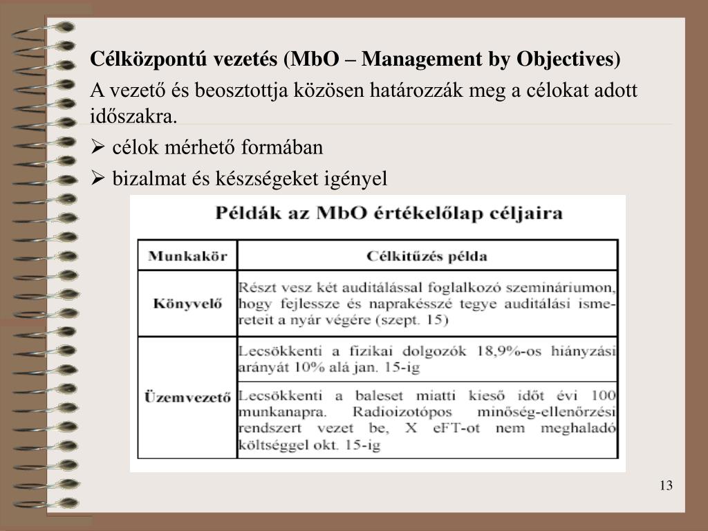 Célközpontú vezetés (MbO – Management by Objectives) A vezető és beosztottja közösen határozzák meg a célokat adott időszakra. • célok mérhető formában • bizalmat és készségeket igényel