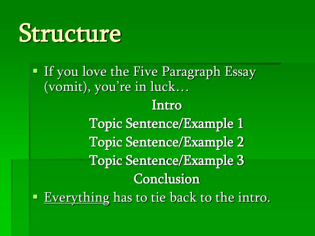 Structure • If you love the Five Paragraph Essay (vomit), you’re in luck… Intro Topic Sentence/Example 1 Topic Sentence/Example 2 Topic Sentence/Example 3 Conclusion • Everything has to tie back to the intro.