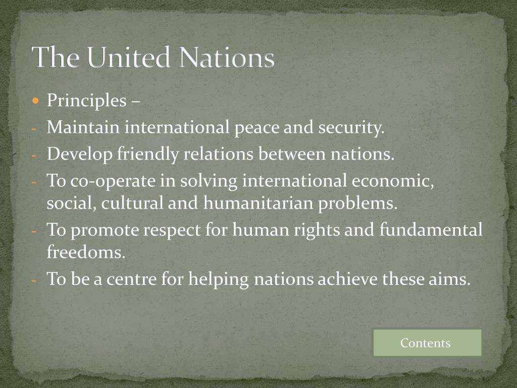 The United Nations • Principles – • Maintain international peace and security. • Develop friendly relations between nations. • To co-operate in solving international economic, social, cultural and humanitarian problems. • To promote respect for human rights and fundamental freedoms. • To be a centre for helping nations achieve these aims. Contents