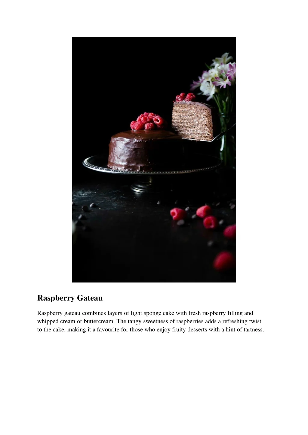 Raspberry Gateau Raspberry gateau combines layers of light sponge cake with fresh raspberry filling and whipped cream or buttercream. The tangy sweetness of raspberries adds a refreshing twist to the cake, making it a favourite for those who enjoy fruity desserts with a hint of tartness.