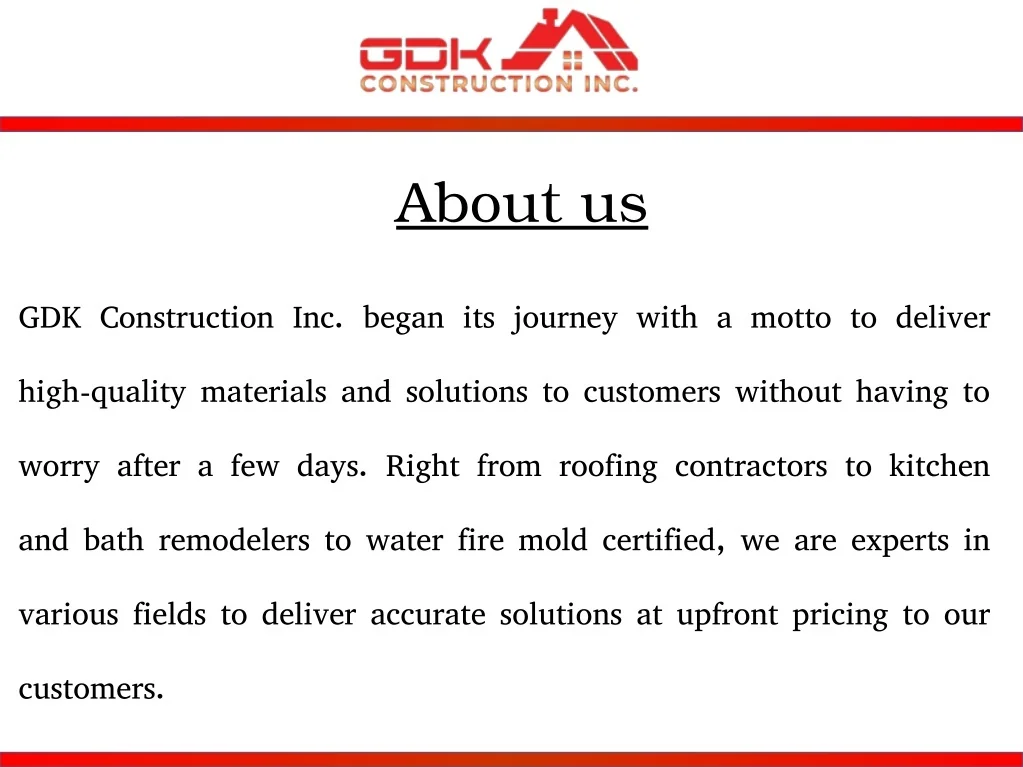 1. About us GDK Construction Inc. began its journey with a motto to deliver high-quality materials and solutions to customers without having to worry after a few days. Right from roofing contractors to kitchen and bath remodelers to water fire mold certified, we are experts in various fields to deliver accurate solutions at upfront pricing to our customers.