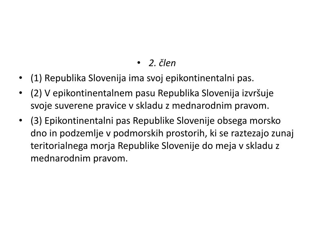 2. člen • (1) Republika Slovenija ima svoj epikontinentalni pas. • (2) V epikontinentalnem pasu Republika Slovenija izvršuje svoje suverene pravice v skladu z mednarodnim pravom. • (3) Epikontinentalni pas Republike Slovenije obsega morsko dno in podzemlje v podmorskih prostorih, ki se raztezajo zunaj teritorialnega morja Republike Slovenije do meja v skladu z mednarodnim pravom.