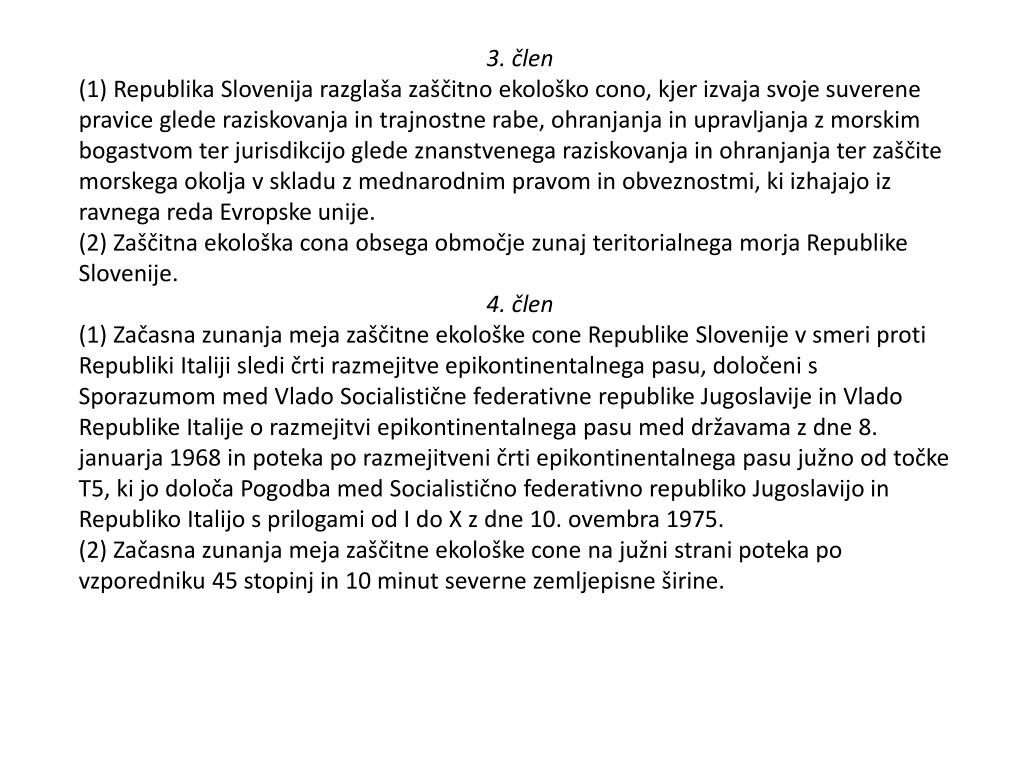 3. člen (1) Republika Slovenija razglaša zaščitno ekološko cono, kjer izvaja svoje suverene pravice glede raziskovanja in trajnostne rabe, ohranjanja in upravljanja z morskim bogastvom ter jurisdikcijo glede znanstvenega raziskovanja in ohranjanja ter zaščite morskega okolja v skladu z mednarodnim pravom in obveznostmi, ki izhajajo iz ravnega reda Evropske unije. (2) Zaščitna ekološka cona obsega območje zunaj teritorialnega morja Republike Slovenije. 4. člen (1) Začasna zunanja meja zaščitne ekološke cone Republike Slovenije v smeri proti Republiki Italiji sledi črti razmejitve epikontinentalnega pasu, določeni s Sporazumom med Vlado Socialistične federativne republike Jugoslavije in Vlado Republike Italije o razmejitvi epikontinentalnega pasu med državama z dne 8. januarja 1968 in poteka po razmejitveni črti epikontinentalnega pasu južno od točke T5, ki jo določa Pogodba med Socialistično federativno republiko Jugoslavijo in Republiko Italijo s prilogami od I do X z dne 10. ovembra1975. (2) Začasna zunanja meja zaščitne ekološke cone na južni strani poteka po vzporedniku 45 stopinj in 10 minut severne zemljepisne širine.