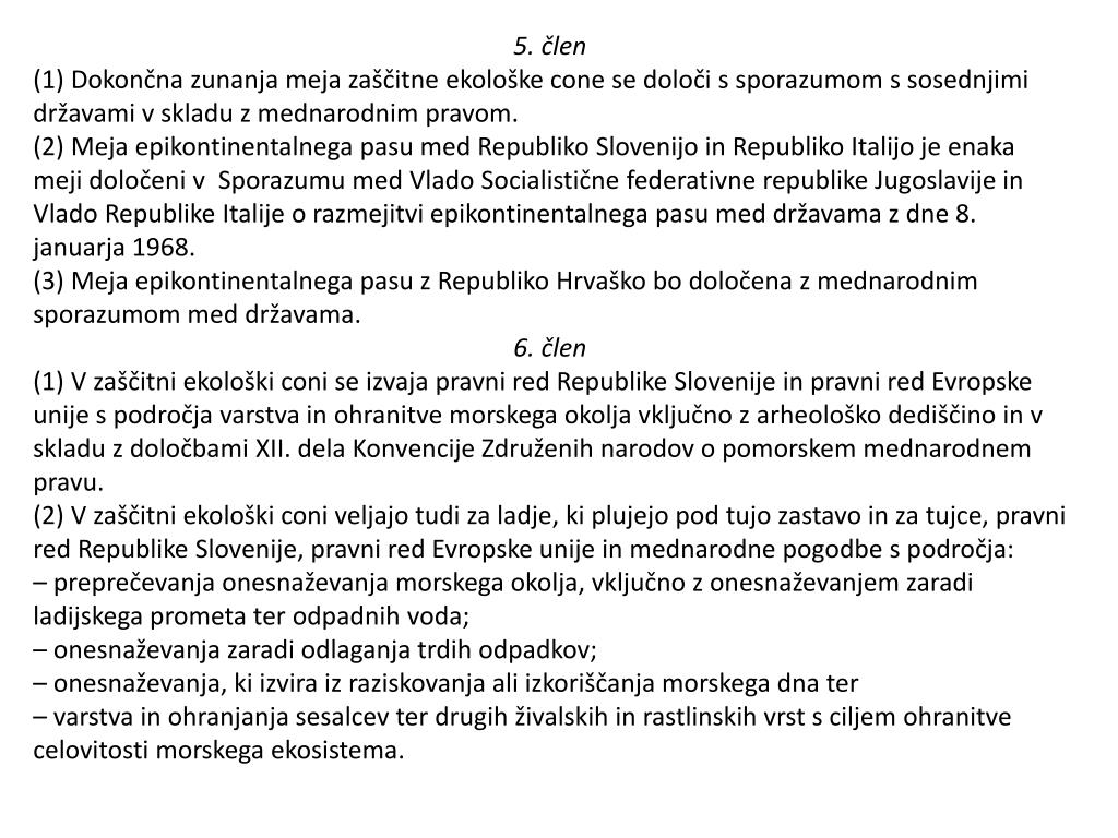 Z A K O N O RAZGLASITVI ZAŠČITNE EKOLOŠKE CONE IN EPIKONTINENTALNEM PASU REPUBLIKESLOVENIJE (ZRZECEP), Ur. l. RS, št. 93/2005 • 1. člen • S tem zakonom Republika Slovenija razglaša zaščitno ekološko cono in ureja izvrševanje svojih suverenih pravic v epikontinentalnem pasu v skladu z mednarodnim pravom, še zlasti s Konvencijo Združenih narodov o pomorskem mednarodnem pravu (Uradni list SFRJ-MP, št. 1/86; Akt o notifikaciji nasledstva, Uradni list RS-MP, št. Stran 9668 / Št. 93 / 21. 10. 2005 Uradni list Republike Slovenije 22-103/94), Sporazumom med Vlado Socialistične federativne republike Jugoslavije in Vlado Republike Italije o razmejitvi epikontinentalnega pasu med državama z dne 8. januarja 1968 (Uradni list SFRJ-MP, št. 28/70; nota št. ZSD-JVE/46/03 z dne 24. julija 2003 in nota št. 003889/205 z dne 22. decembra 2003), Pogodbo med Socialistično federativno republiko Jugoslavijo in Republiko Italijo s prilogami od I do X z dne 10. novembra 1975 (Uradni list SFRJ-MP, št. 1/77; Akt o notifikaciji nasledstva, Uradni list RS-MP, št. 11-60/92) in Pomorskim zakonikom (Uradni list RS, št. 37/04 – uradno prečiščeno besedilo).