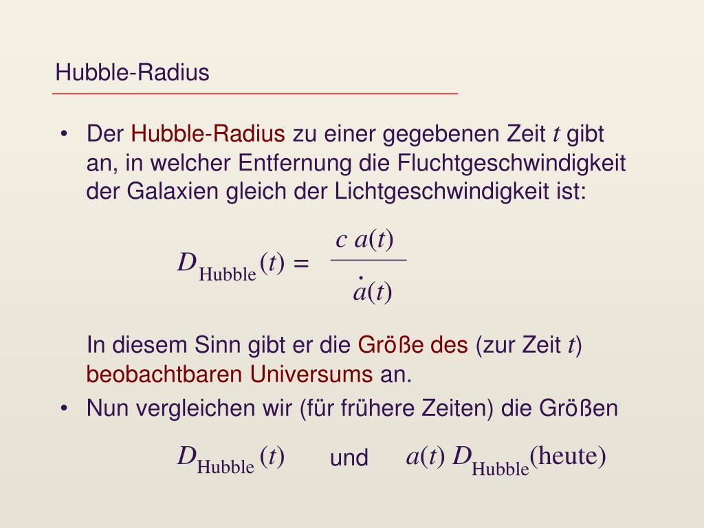 Hubble-Radius • Der Hubble-Radius zu einer gegebenen Zeit t gibt an, in welcher Entfernung die Fluchtgeschwindigkeit der Galaxien gleich der Lichtgeschwindigkeit ist: c a(t) D (t) = . Hubble a(t) • In diesem Sinn gibt er die Größe des (zur Zeit t) beobachtbaren Universums an. • Nun vergleichen wir (für frühere Zeiten) die Größen D (t) a(t) D (heute) und Hubble Hubble