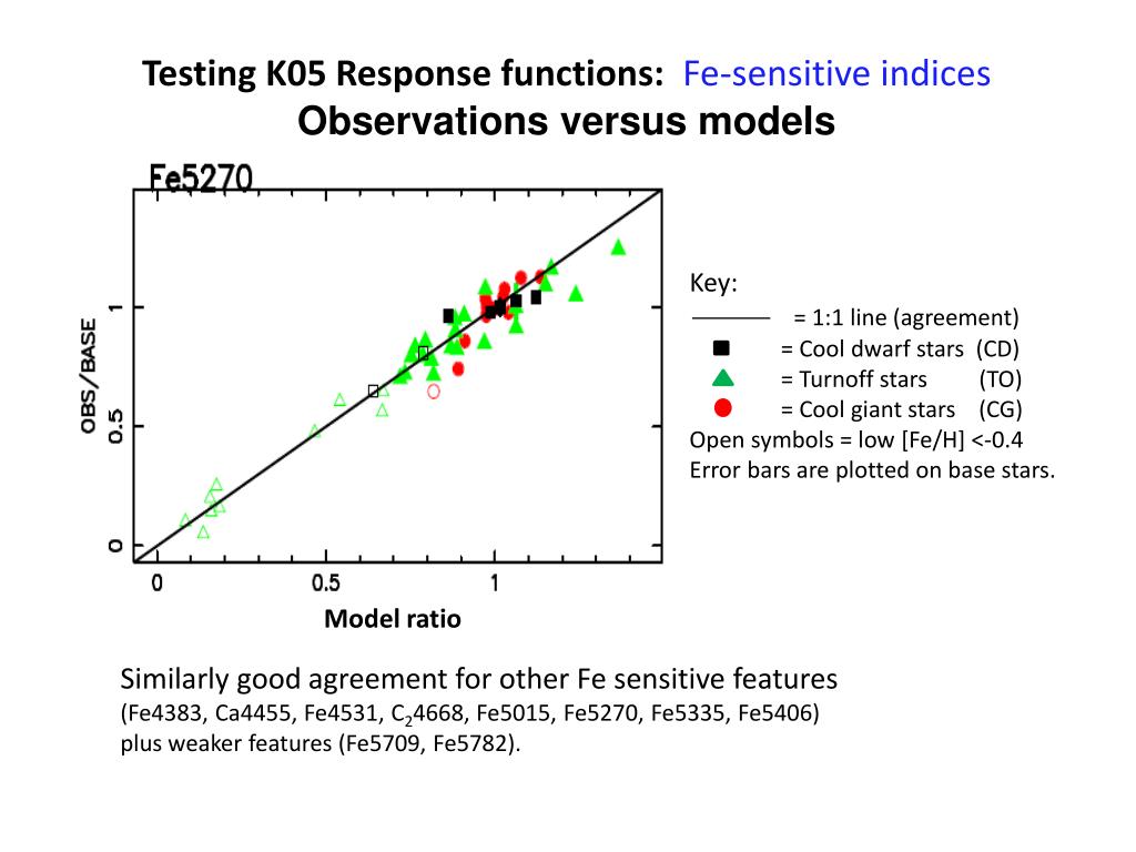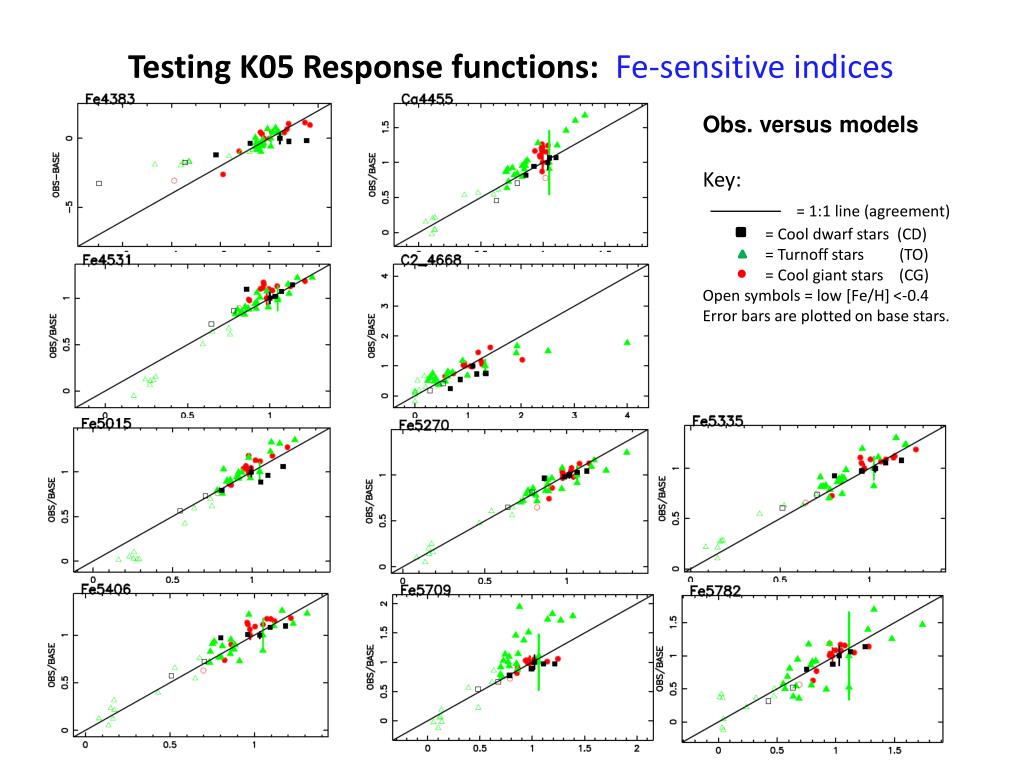 Key: = 1:1 line (agreement) = Cool dwarf stars (CD) = Turnoff stars (TO) = Cool giant stars (CG) Open symbols = low [Fe/H] <-0.4 Error bars are plotted on base stars. Testing K05 Response functions: Fe-sensitive indicesObservations versus models Model ratio Similarly good agreement for other Fe sensitive features (Fe4383, Ca4455, Fe4531, C24668, Fe5015, Fe5270, Fe5335, Fe5406) plus weaker features (Fe5709, Fe5782).