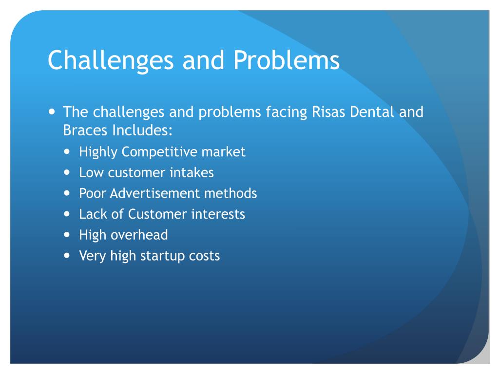 Challenges and Problems • The challenges and problems facing Risas Dental and Braces Includes: • Highly Competitive market • Low customer intakes • Poor Advertisement methods • Lack of Customer interests • High overhead • Very high startup costs