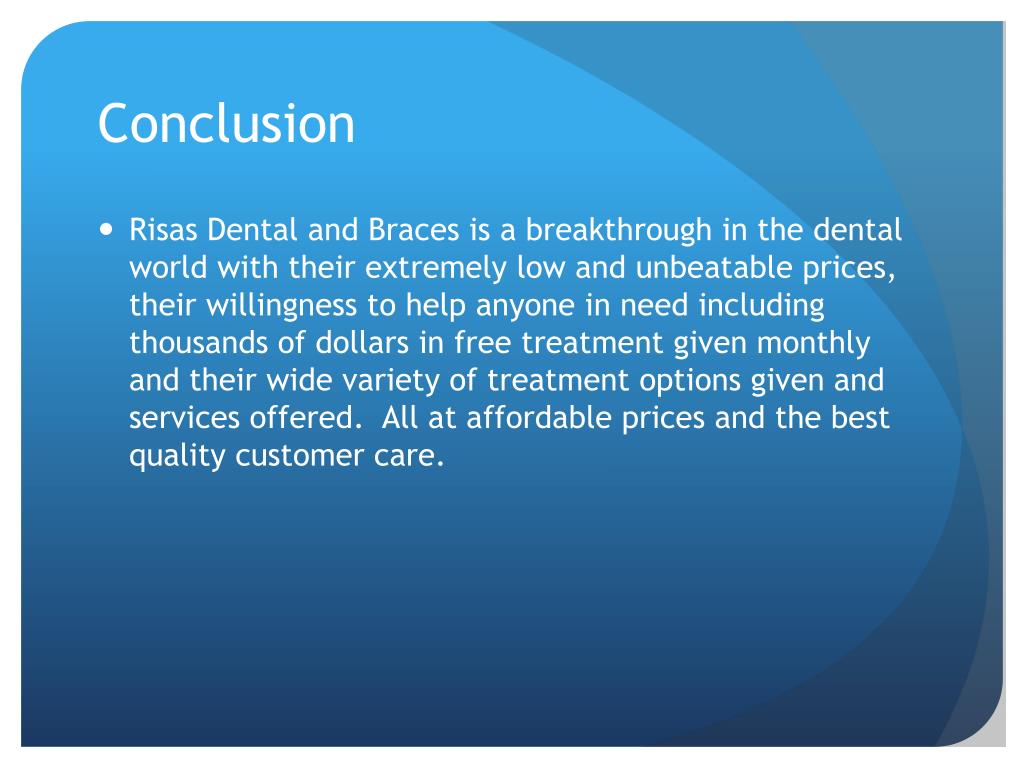 Conclusion • Risas Dental and Braces is a breakthrough in the dental world with their extremely low and unbeatable prices, their willingness to help anyone in need including thousands of dollars in free treatment given monthly and their wide variety of treatment options given and services offered. All at affordable prices and the best quality customer care.