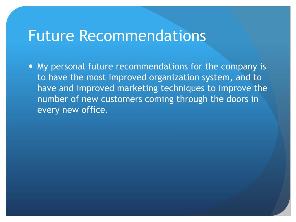 Future Recommendations • My personal future recommendations for the company is to have the most improved organization system, and to have and improved marketing techniques to improve the number of new customers coming through the doors in every new office.
