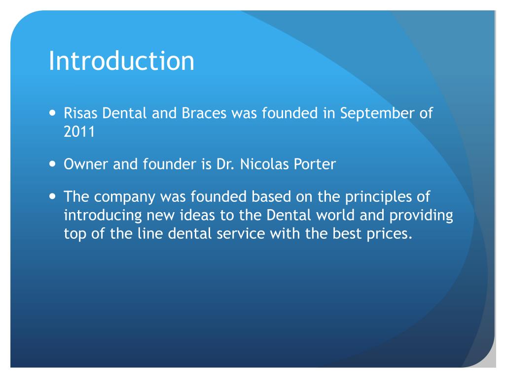 Introduction • Risas Dental and Braces was founded in September of 2011 • Owner and founder is Dr. Nicolas Porter • The company was founded based on the principles of introducing new ideas to the Dental world and providing top of the line dental service with the best prices.