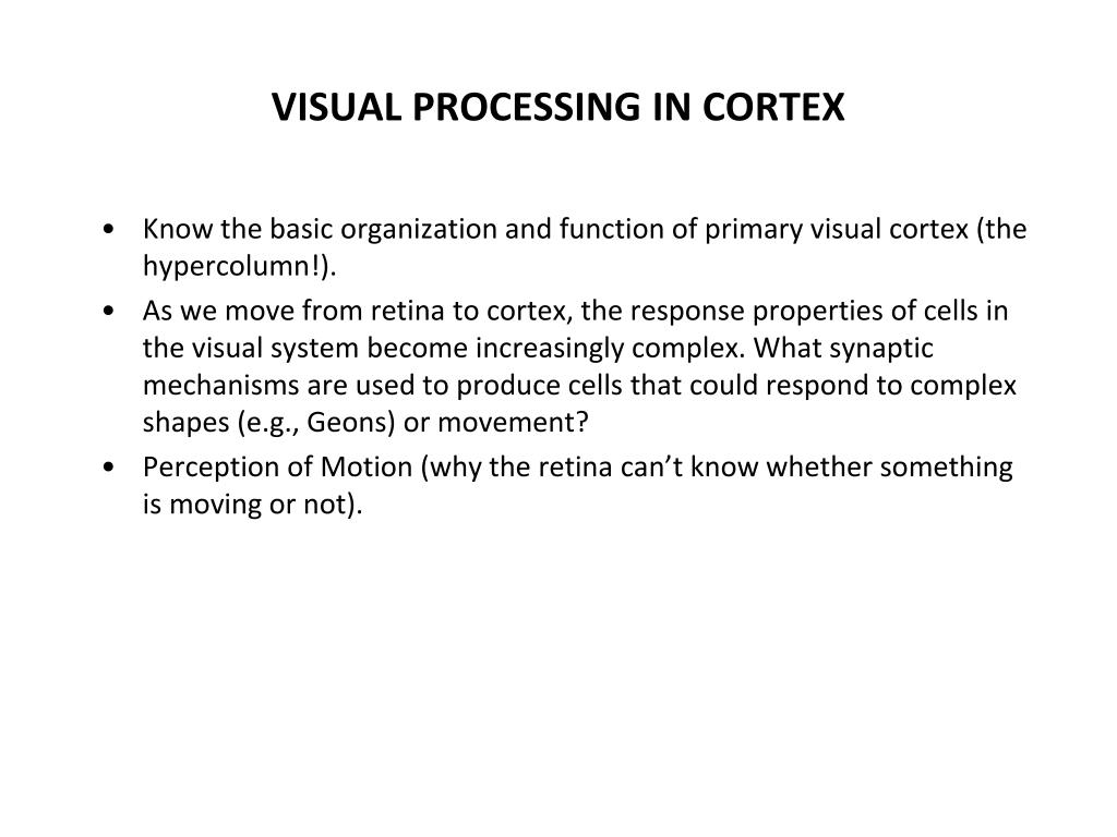 VISUAL PROCESSING IN CORTEX • Know the basic organization and function of primary visual cortex (the hypercolumn!). • As we move from retina to cortex, the response properties of cells in the visual system become increasingly complex. What synaptic mechanisms are used to produce cells that could respond to complex shapes (e.g., Geons) or movement? • Perception of Motion (why the retina can’t know whether something is moving or not).