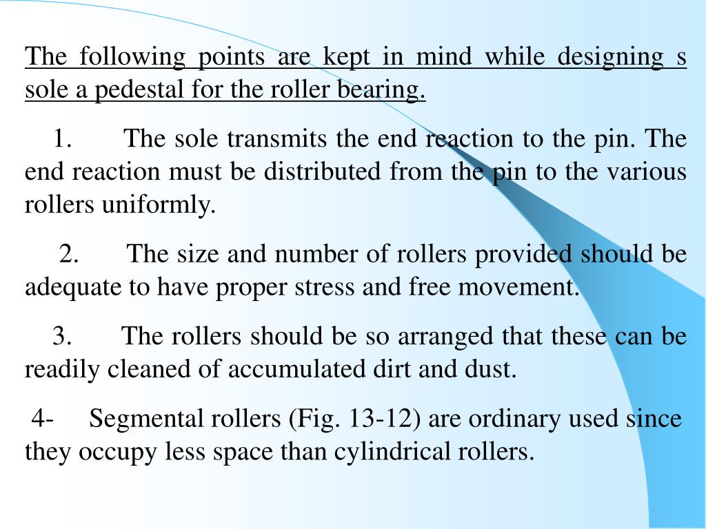The following points are kept in mind while designing s sole a pedestal for the roller bearing. 1. The sole transmits the end reaction to the pin. The end reaction must be distributed from the pin to the various rollers uniformly. 2. The size and number of rollers provided should be adequate to have proper stress and free movement. 3. The rollers should be so arranged that these can be readily cleaned of accumulated dirt and dust. 4- Segmental rollers (Fig. 13-12) are ordinary used since they occupy less space than cylindrical rollers.