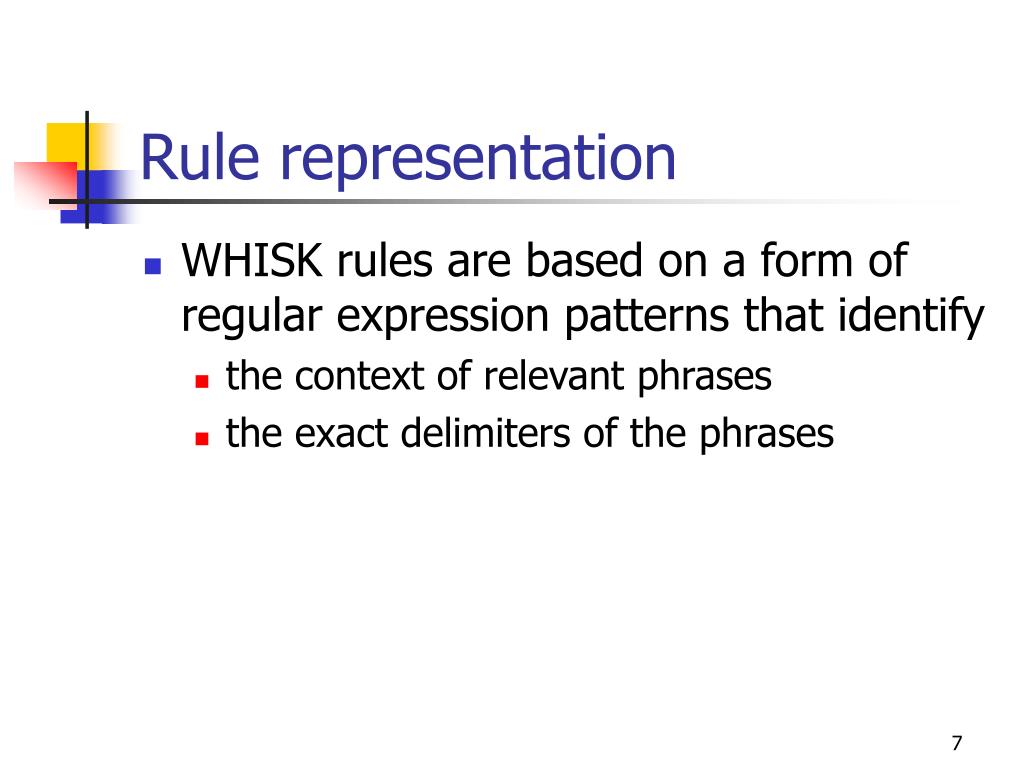 Rule representation • WHISK rules are based on a form of regular expression patterns that identify • the context of relevant phrases • the exact delimiters of the phrases