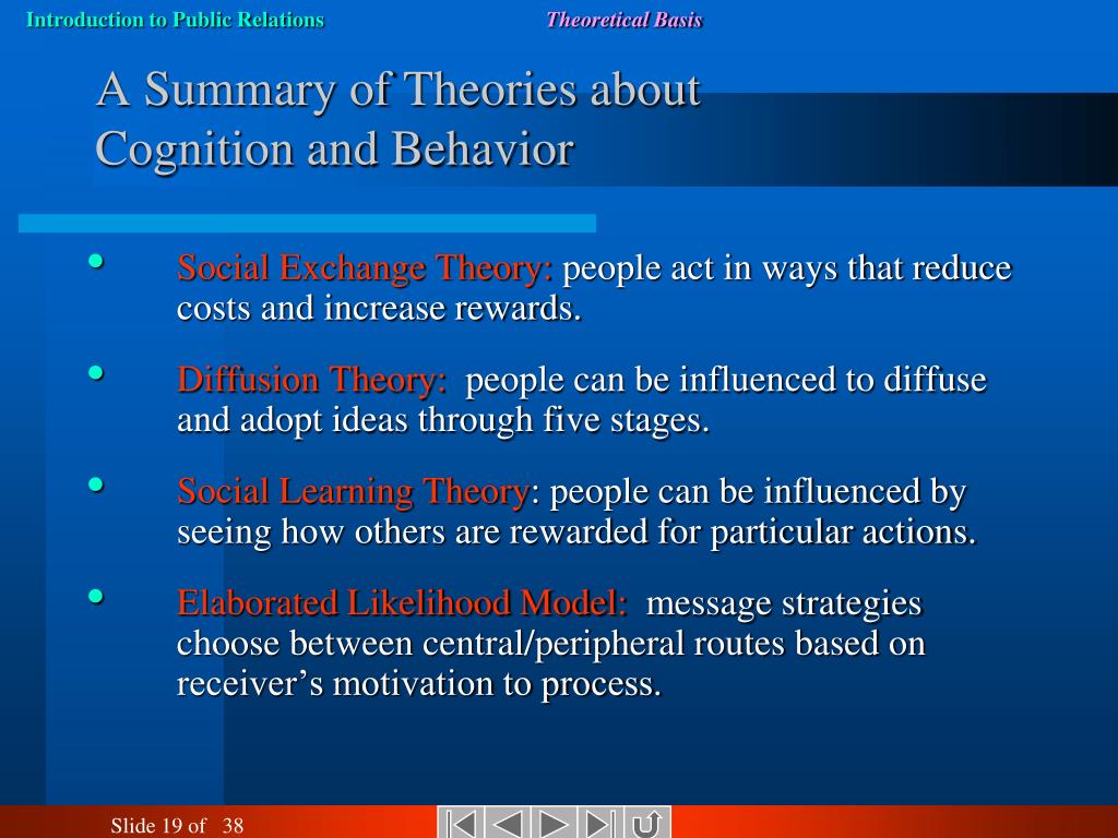 A Summary of Theories about Cognition and Behavior • Social Exchange Theory: people act in ways that reduce costs and increase rewards. • Diffusion Theory: people can be influenced to diffuse and adopt ideas through five stages. • Social Learning Theory: people can be influenced by seeing how others are rewarded for particular actions. • Elaborated Likelihood Model: message strategies choose between central/peripheral routes based on receiver’s motivation to process.