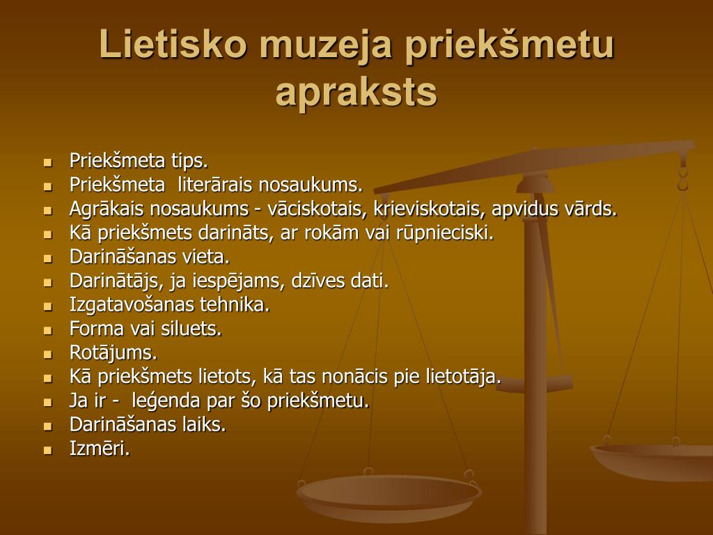 Lietisko muzeja priekšmetu apraksts • Priekšmeta tips. • Priekšmeta literārais nosaukums. • Agrākais nosaukums - vāciskotais, krieviskotais, apvidus vārds. • Kā priekšmets darināts, ar rokām vai rūpnieciski. • Darināšanas vieta. • Darinātājs, ja iespējams, dzīves dati. • Izgatavošanas tehnika. • Forma vai siluets. • Rotājums. • Kā priekšmets lietots, kā tas nonācis pie lietotāja. • Ja ir - leģenda par šo priekšmetu. • Darināšanas laiks. • Izmēri.