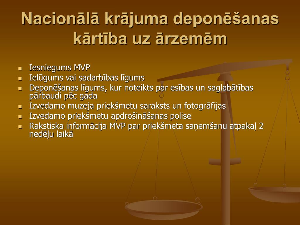 Nacionālā krājuma deponēšanas kārtība uz ārzemēm • Iesniegums MVP • Ielūgums vai sadarbības līgums • Deponēšanas līgums, kur noteikts par esības un saglabātības pārbaudi pēc gada • Izvedamo muzeja priekšmetu saraksts un fotogrāfijas • Izvedamo priekšmetu apdrošināšanas polise • Rakstiska informācija MVP par priekšmeta saņemšanu atpakaļ 2 nedēļu laikā