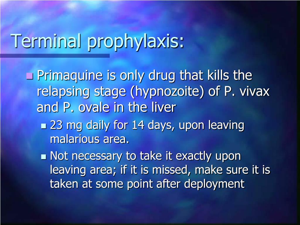Terminal prophylaxis: • Primaquine is only drug that kills the relapsing stage (hypnozoite) of P. vivax and P. ovale in the liver • 23 mg daily for 14 days, upon leaving malarious area. • Not necessary to take it exactly upon leaving area; if it is missed, make sure it is taken at some point after deployment