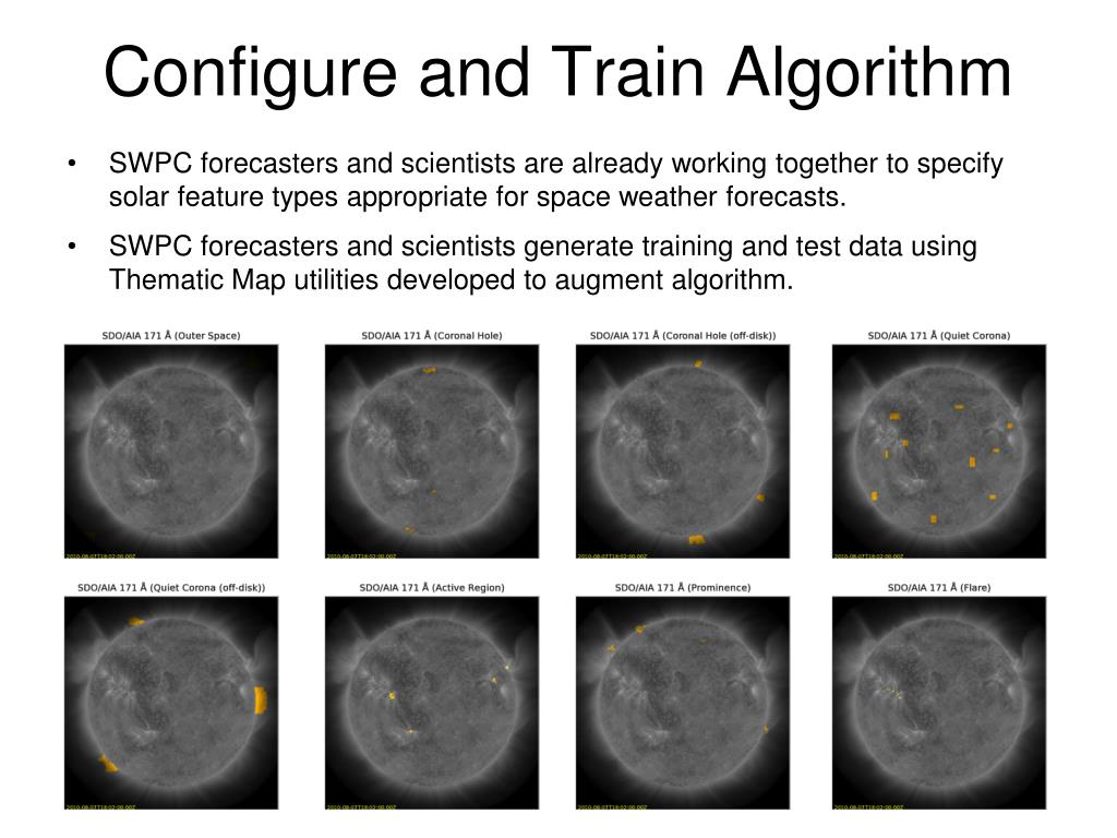 Configure and Train Algorithm • SWPC forecasters and scientists are already working together to specify solar feature types appropriate for space weather forecasts. • SWPC forecasters and scientists generate training and test data using Thematic Map utilities developed to augment algorithm.