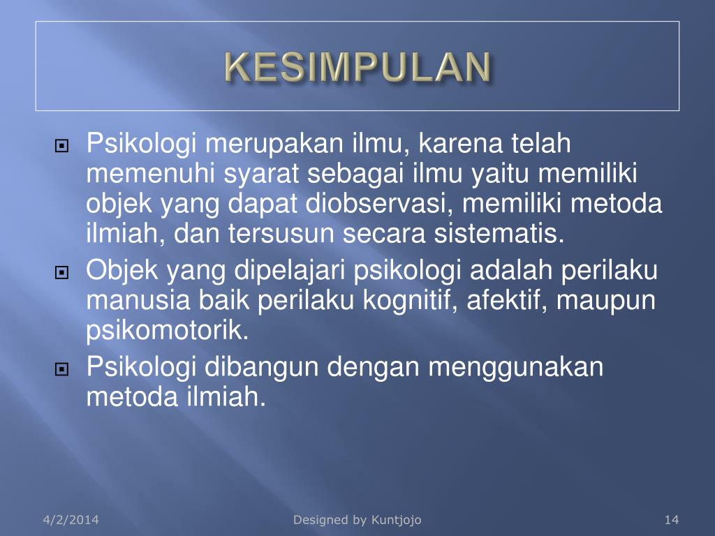 KESIMPULAN • Psikologi merupakan ilmu, karena telah memenuhi syarat sebagai ilmu yaitu memiliki objek yang dapat diobservasi, memiliki metoda ilmiah, dan tersusun secara sistematis. • Objek yang dipelajari psikologi adalah perilaku manusia baik perilaku kognitif, afektif, maupun psikomotorik. • Psikologi dibangun dengan menggunakan metoda ilmiah. Designed by Kuntjojo