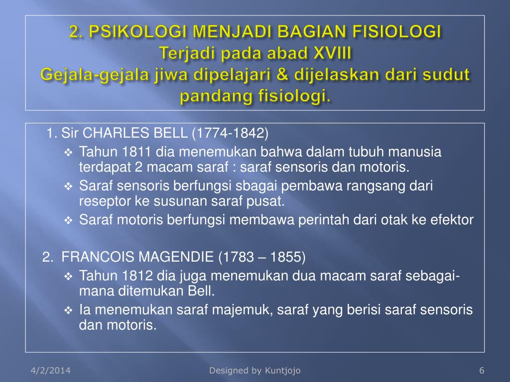 2. PSIKOLOGI MENJADI BAGIAN FISIOLOGITerjadipadaabad XVIIIGejala-gejalajiwadipelajari & dijelaskandarisudutpandangfisiologi. 1. Sir CHARLES BELL (1774-1842) • Tahun 1811 dia menemukan bahwa dalam tubuh manusia terdapat 2 macam saraf : saraf sensoris dan motoris. • Saraf sensoris berfungsi sbagai pembawa rangsang dari reseptor ke susunan saraf pusat. • Saraf motoris berfungsi membawa perintah dari otak ke efektor 2. FRANCOIS MAGENDIE (1783 – 1855) • Tahun 1812 dia juga menemukan dua macam saraf sebagai-mana ditemukan Bell. • Ia menemukan saraf majemuk, saraf yang berisi saraf sensoris dan motoris. Designed by Kuntjojo