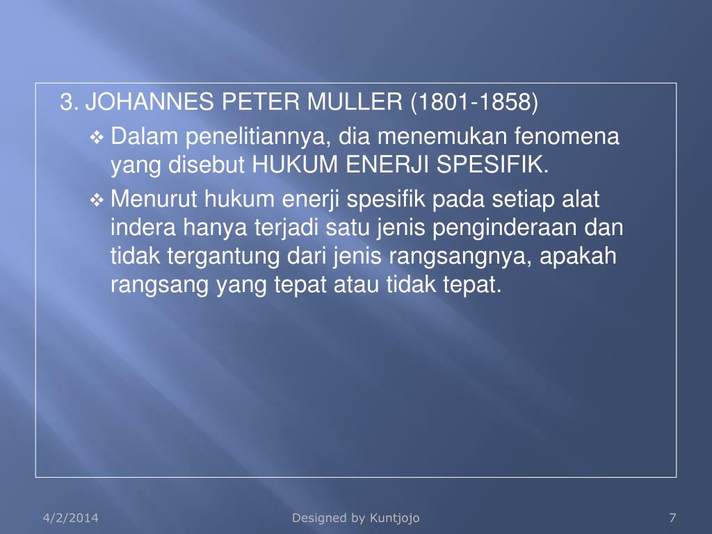 3. JOHANNES PETER MULLER (1801-1858) • Dalam penelitiannya, dia menemukan fenomena yang disebut HUKUM ENERJI SPESIFIK. • Menurut hukum enerji spesifik pada setiap alat indera hanya terjadi satu jenis penginderaan dan tidak tergantung dari jenis rangsangnya, apakah rangsang yang tepat atau tidak tepat. Designed by Kuntjojo