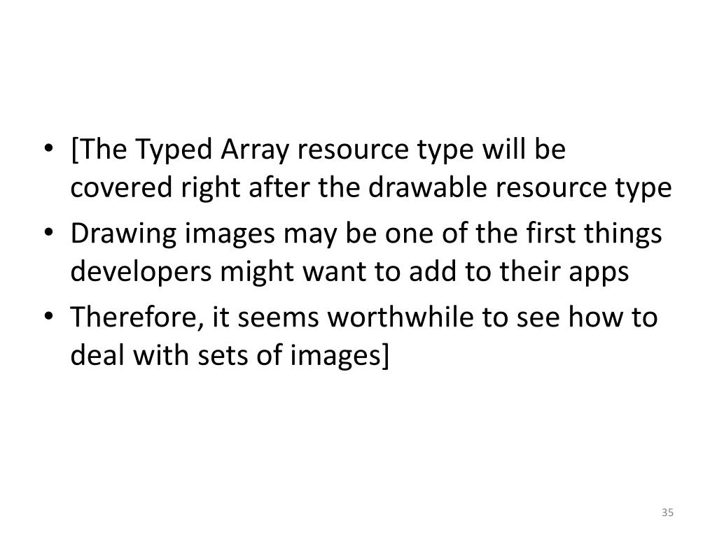 [The Typed Array resource type will be covered right after the drawable resource type • Drawing images may be one of the first things developers might want to add to their apps • Therefore, it seems worthwhile to see how to deal with sets of images]