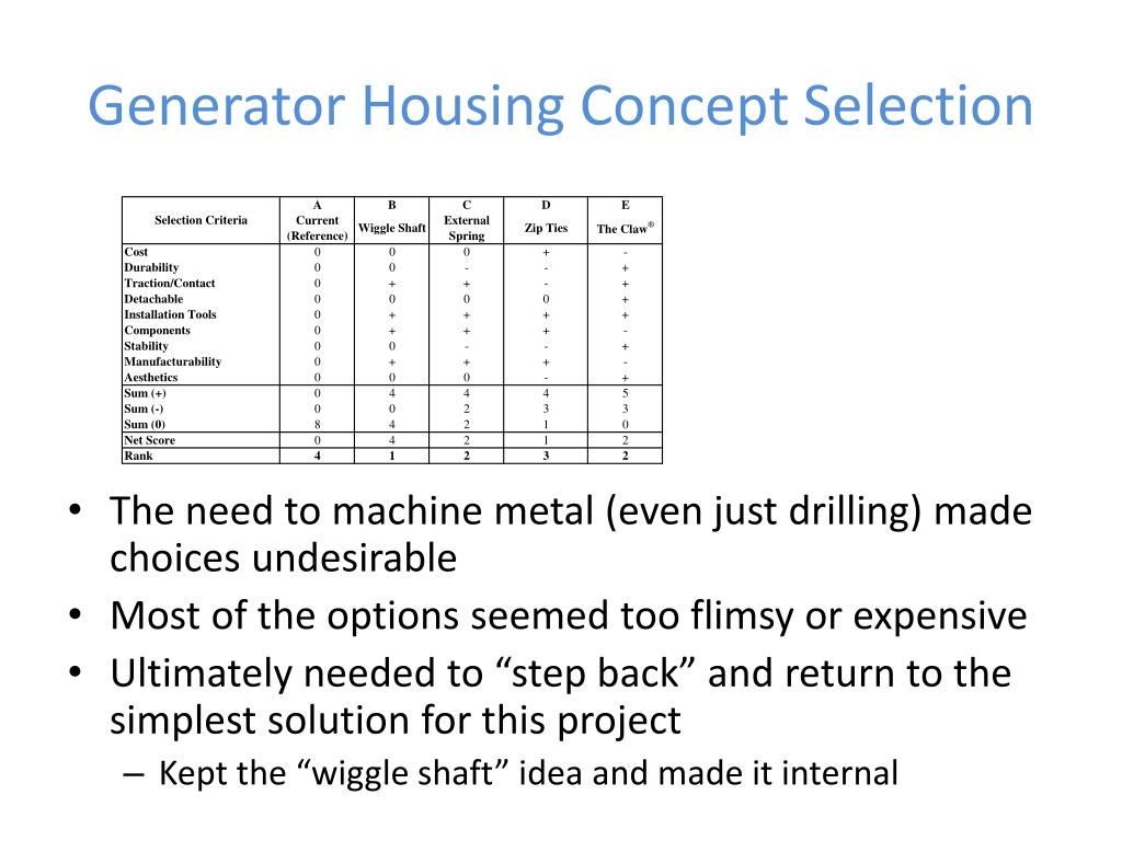 Generator Housing Concept Selection • The need to machine metal (even just drilling) made choices undesirable • Most of the options seemed too flimsy or expensive • Ultimately needed to “step back” and return to the simplest solution for this project • Kept the “wiggle shaft” idea and made it internal