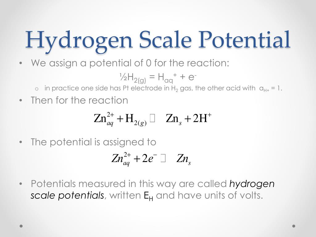 Hydrogen Scale Potential • We assign a potential of 0 for the reaction: ½H2(g) = Haq+ + e- • in practice one side has Pt electrode in H2 gas, the other acid with aH+ = 1. • Then for the reaction • The potential is assigned to • Potentials measured in this way are called hydrogen scale potentials, written EH and have units of volts.