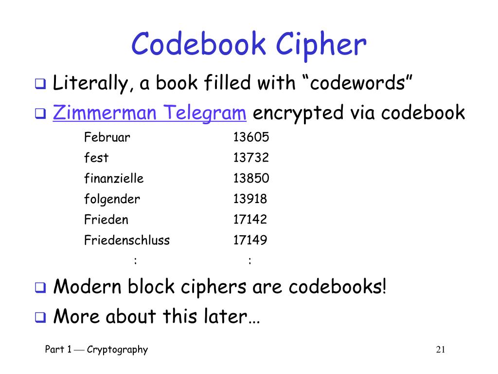 Codebook Cipher • Literally, a book filled with “codewords” • Zimmerman Telegram encrypted via codebook Februar 13605 fest 13732 finanzielle 13850 folgender 13918 Frieden 17142 Friedenschluss 17149 : : • Modern block ciphers are codebooks! • More about this later… Part 1 Cryptography 21