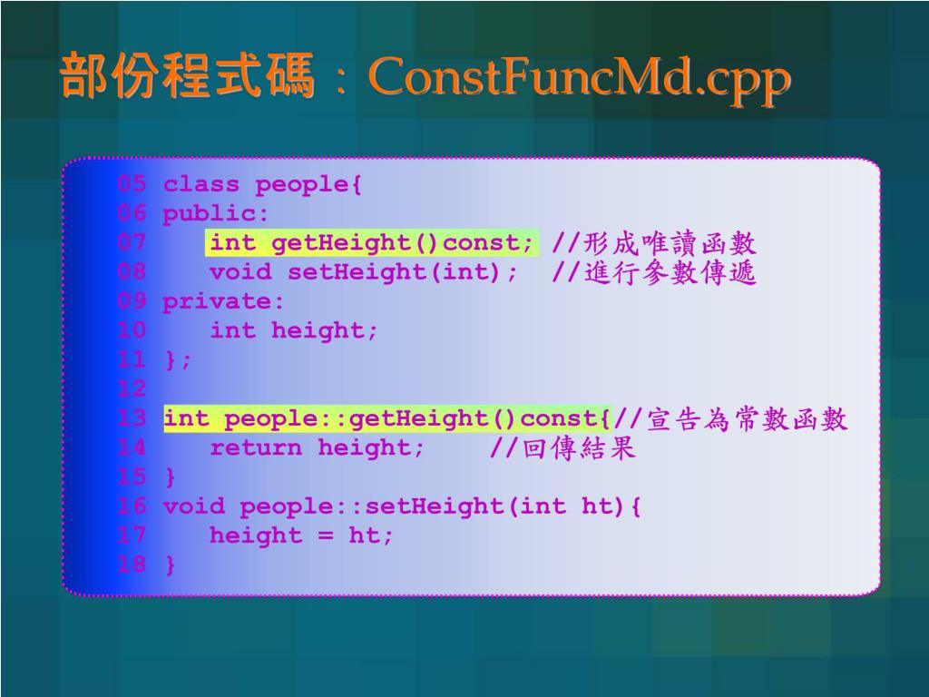 常數函式的特性 • 第18行為什麼會產生錯誤?這是一個很典型的OOP程式 • 將height屬性的存取權限設為private • 利用setHeight()成員函數來修改屬性 • 再透過getHeight()成員函數回傳物件改變後的狀態 • 問題就出自於setHeight()成員函數已經被宣告為常數函數,表示它不能修改物件的屬性,因此const很明顯放錯位置,我們將程式碼修正。