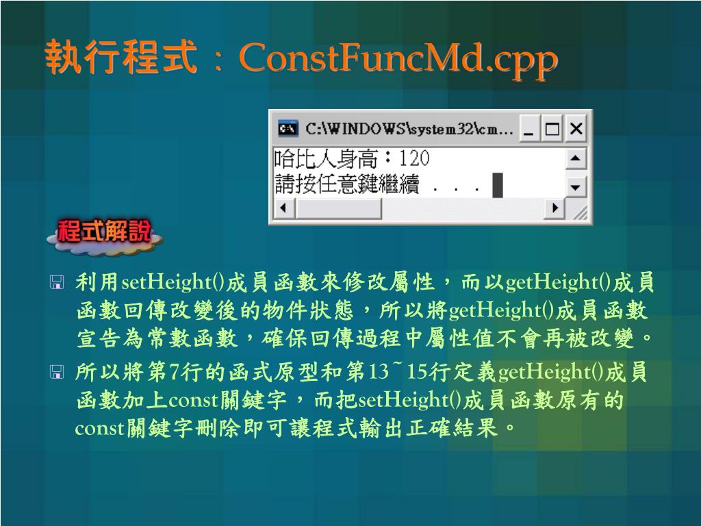 執行程式:ConstFuncMd.cpp • 利用setHeight()成員函數來修改屬性,而以getHeight()成員函數回傳改變後的物件狀態,所以將getHeight()成員函數宣告為常數函數,確保回傳過程中屬性值不會再被改變。 • 所以將第7行的函式原型和第13~15行定義getHeight()成員函數加上const關鍵字,而把setHeight()成員函數原有的const關鍵字刪除即可讓程式輸出正確結果。