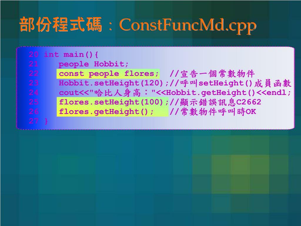 執行程式:ConstFuncMd.cpp 顯示錯誤訊息:ConstFuncMd.cpp(25) : error C2662: 'people::setHeight' : 無法將'this' 指標從'const people' 轉換成'people &'轉換遺失限定詞 • 範例中原有的內容並沒有改變,在主程式中第22行宣告flores為常數物件,然後在第25、26行分別呼叫了setHeight()和getHeight()二個成員函數 • 因為flores是常數物件,所以只能呼叫常數函數getHeight() • 當常數物件呼叫了setHeight()成員函數時會顯示錯誤訊息