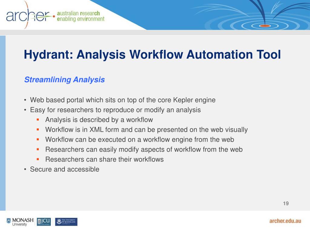Hydrant: Analysis Workflow Automation Tool • Streamlining Analysis • Web based portal which sits on top of the core Kepler engine • Easy for researchers to reproduce or modify an analysis • Analysis is described by a workflow • Workflow is in XML form and can be presented on the web visually • Workflow can be executed on a workflow engine from the web • Researchers can easily modify aspects of workflow from the web • Researchers can share their workflows • Secure and accessible