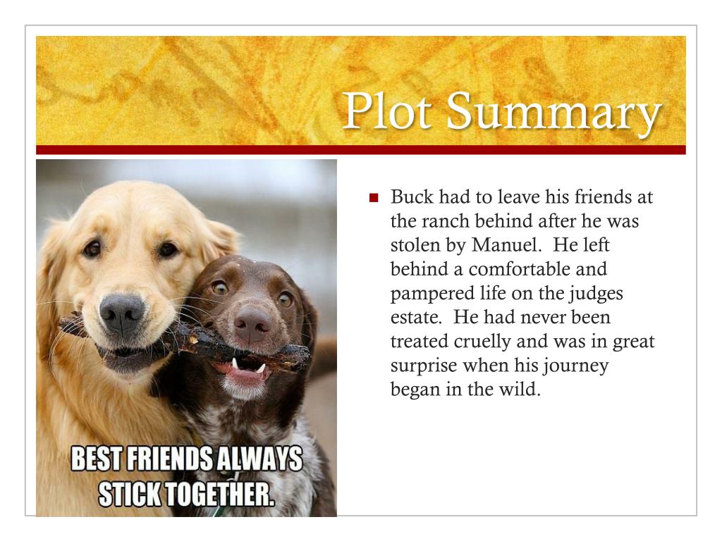 Plot Summary • Buck had to leave his friends at the ranch behind after he was stolen by Manuel. He left behind a comfortable and pampered life on the judges estate. He had never been treated cruelly and was in great surprise when his journey began in the wild.