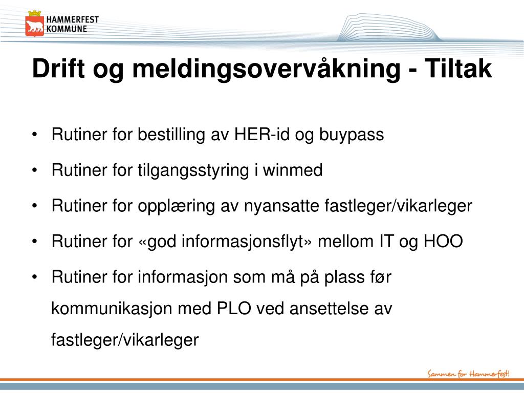 Drift og meldingsovervåkning - Tiltak • Rutiner for bestilling av HER-id og buypass • Rutiner for tilgangsstyring i winmed • Rutiner for opplæring av nyansatte fastleger/vikarleger • Rutiner for «god informasjonsflyt» mellom IT og HOO • Rutiner for informasjon som må på plass før kommunikasjon med PLO ved ansettelse av fastleger/vikarleger