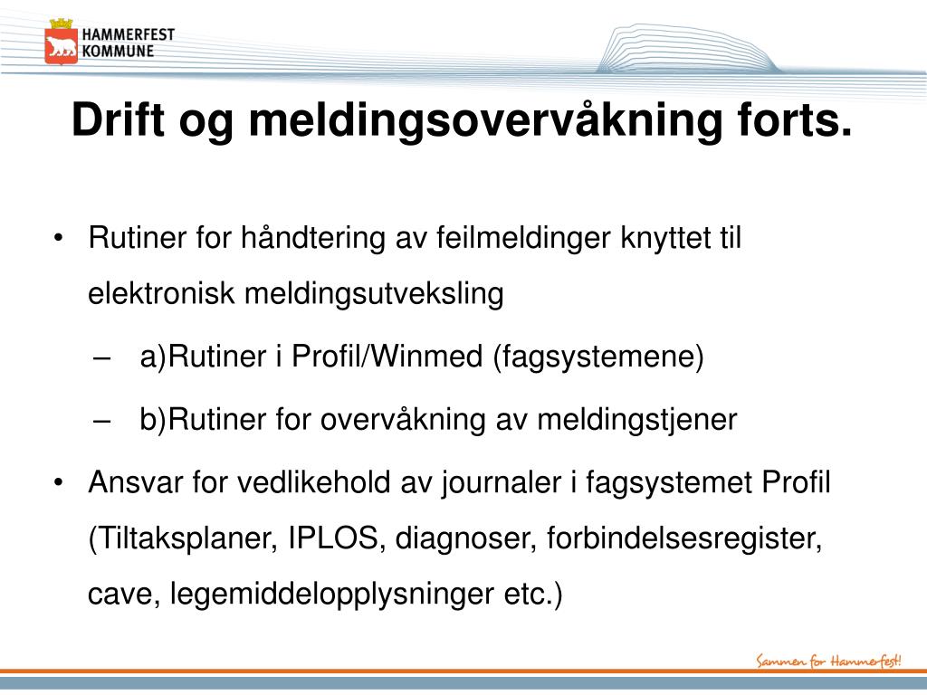 Drift og meldingsovervåkning forts. • Rutiner for håndtering av feilmeldinger knyttet til elektronisk meldingsutveksling • a)Rutiner i Profil/Winmed (fagsystemene) • b)Rutiner for overvåkning av meldingstjener • Ansvar for vedlikehold av journaler i fagsystemet Profil (Tiltaksplaner, IPLOS, diagnoser, forbindelsesregister, cave, legemiddelopplysninger etc.)