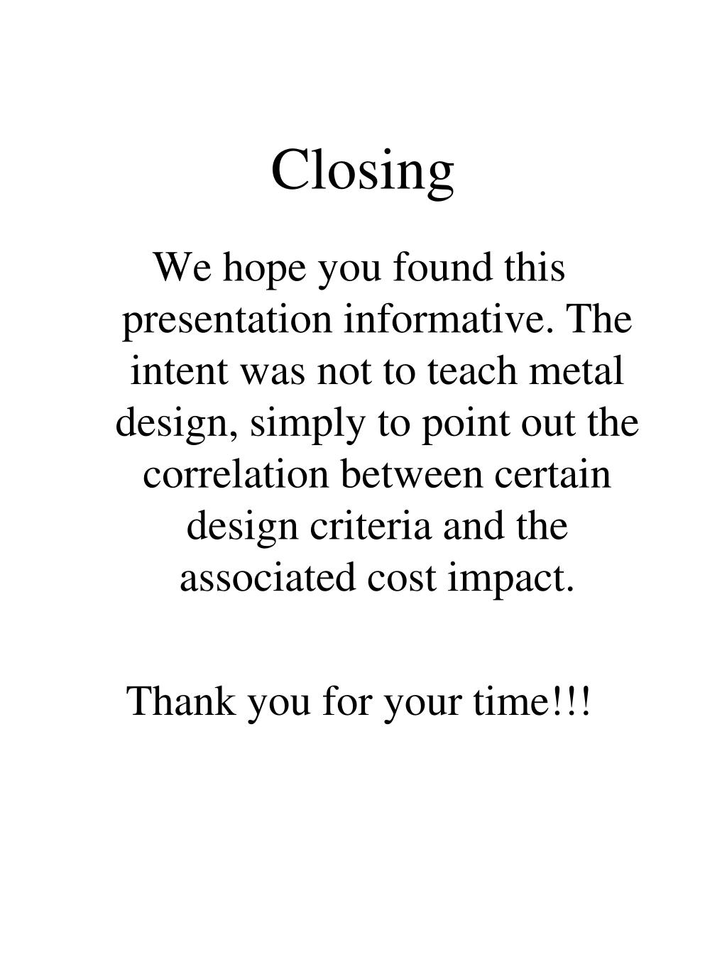 Closing We hope you found this presentation informative. The intent was not to teach metal design, simply to point out the correlation between certain design criteria and the associated cost impact. Thank you for your time!!!