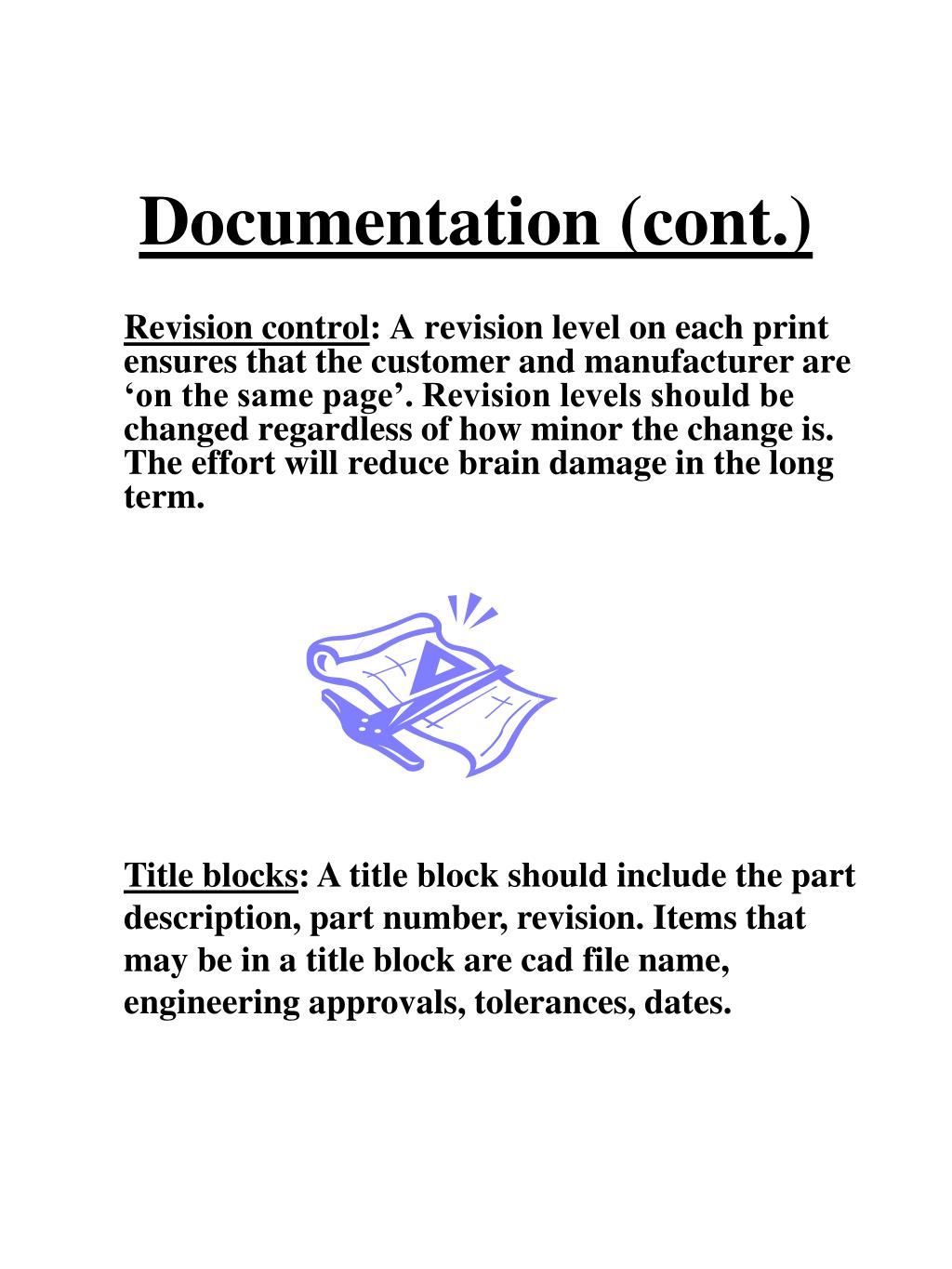 Documentation (cont.) Revision control: A revision level on each print ensures that the customer and manufacturer are ‘on the same page’. Revision levels should be changed regardless of how minor the change is. The effort will reduce brain damage in the long term. Title blocks: A title block should include the part description, part number, revision. Items that may be in a title block are cad file name, engineering approvals, tolerances, dates.