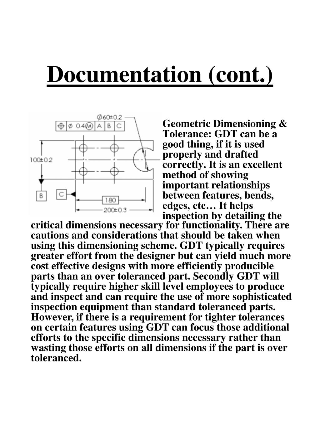 Documentation (cont.) Geometric Dimensioning & Tolerance: GDT can be a good thing, if it is used properly and drafted correctly. It is an excellent method of showing important relationships between features, bends, edges, etc… It helps inspection by detailing the critical dimensions necessary for functionality. There are cautions and considerations that should be taken when using this dimensioning scheme. GDT typically requires greater effort from the designer but can yield much more cost effective designs with more efficiently producible parts than an over toleranced part. Secondly GDT will typically require higher skill level employees to produce and inspect and can require the use of more sophisticated inspection equipment than standard toleranced parts. However, if there is a requirement for tighter tolerances on certain features using GDT can focus those additional efforts to the specific dimensions necessary rather than wasting those efforts on all dimensions if the part is over toleranced.