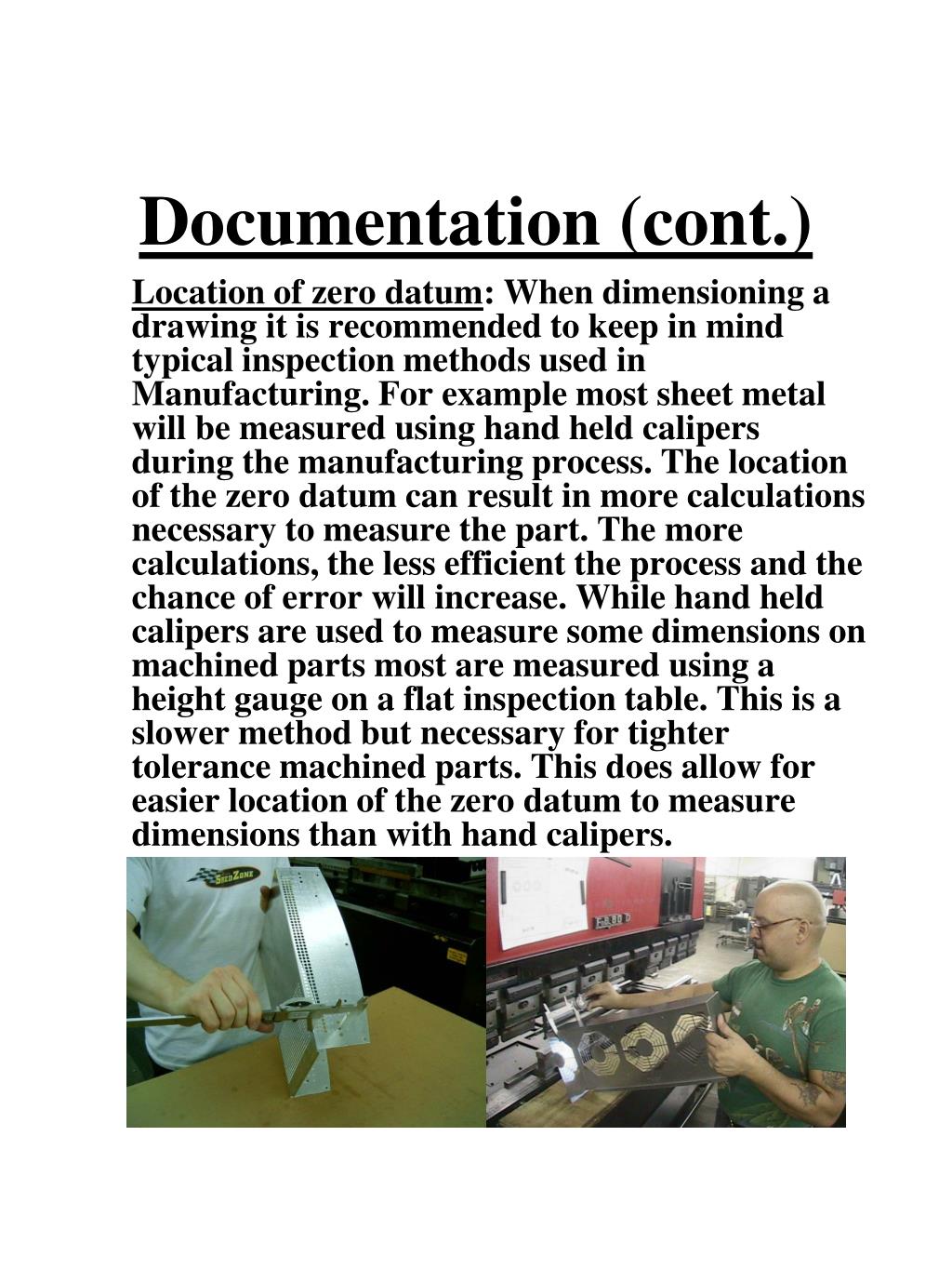 Documentation (cont.) Location of zero datum: When dimensioning a drawing it is recommended to keep in mind typical inspection methods used in Manufacturing. For example most sheet metal will be measured using hand held calipers during the manufacturing process. The location of the zero datum can result in more calculations necessary to measure the part. The more calculations, the less efficient the process and the chance of error will increase. While hand held calipers are used to measure some dimensions on machined parts most are measured using a height gauge on a flat inspection table. This is a slower method but necessary for tighter tolerance machined parts. This does allow for easier location of the zero datum to measure dimensions than with hand calipers.